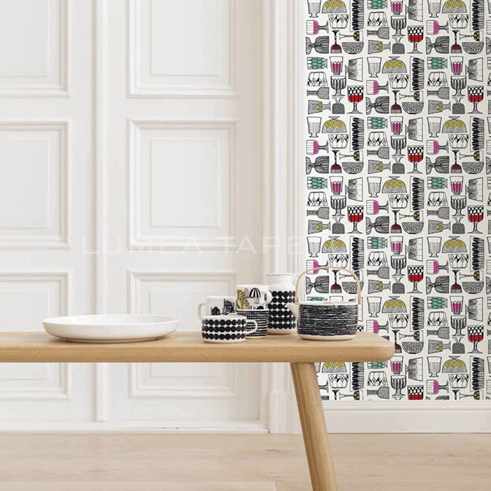 Tapet decorativ vinil super lavabil pe suport vlies ( se aplica adeziv doar pe perete ) lat de 70 cm si lung de 10 m. Model de tapet bucatarie, model desen pahare Jannelli&Volpi.