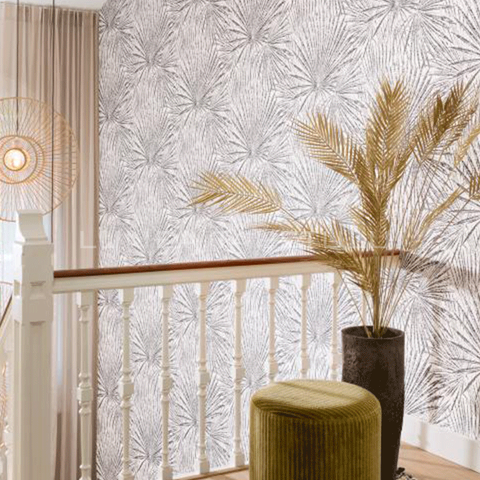 Tapet decorativ vinil super lavabil pe suport vlies ( se aplica adeziv doar pe perete ) lat de 53 cm si lung de 10 m. Model de tapet dormitor, model tapet model desen frunze Rasch 555738.