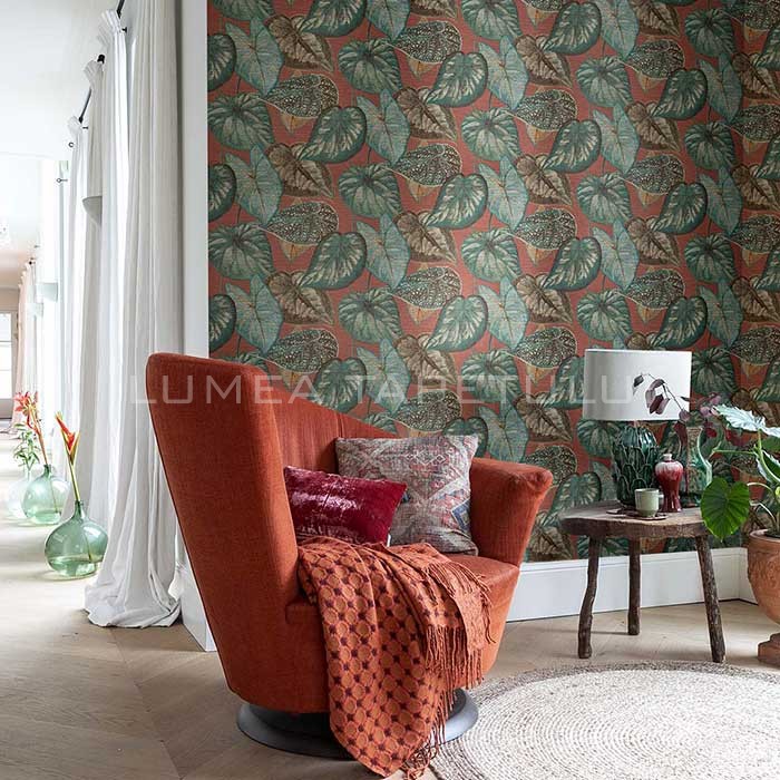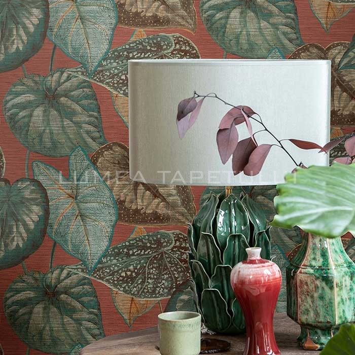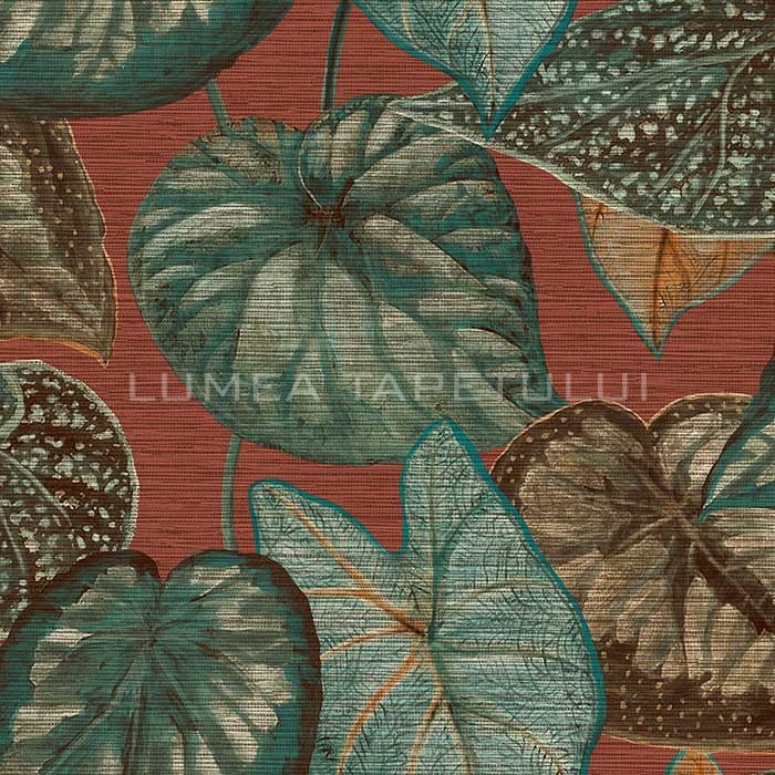 Tapet decorativ vinil super lavabil pe suport vlies ( se aplica adeziv doar pe perete ) lat de 53 cm si lung de 10 m. Model de tapet dormitor , model tapet cu frunze culoare verde – visiniu . Acesta este un tapet modern , ce poate fi utilizat ca tapet living, tapet dormitor, tapet baie sau tapet pentru bucatarie .