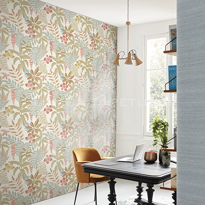Tapet decorativ vinil super lavabil pe suport vlies ( se aplica adeziv doar pe perete ) lat de 1 m si lung de 10 m. Model de tapet dormitor, model tapet model frunze Jannelli&Volpi.