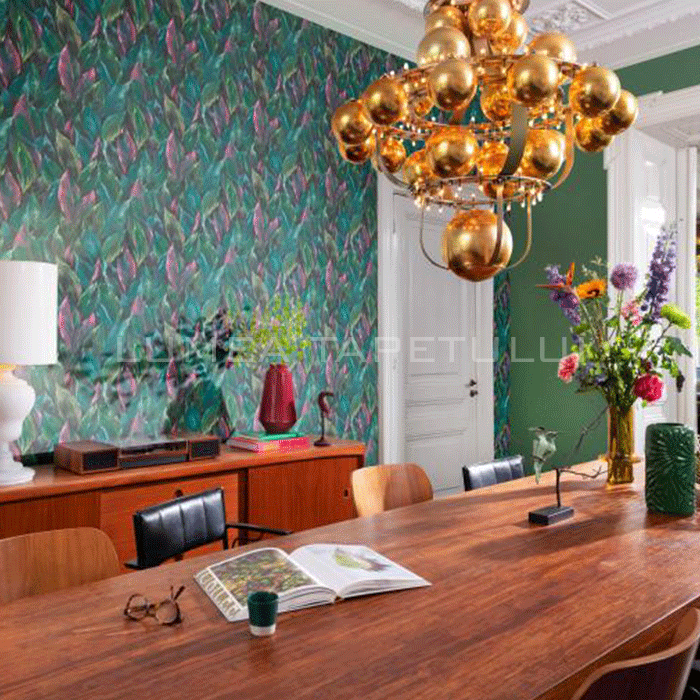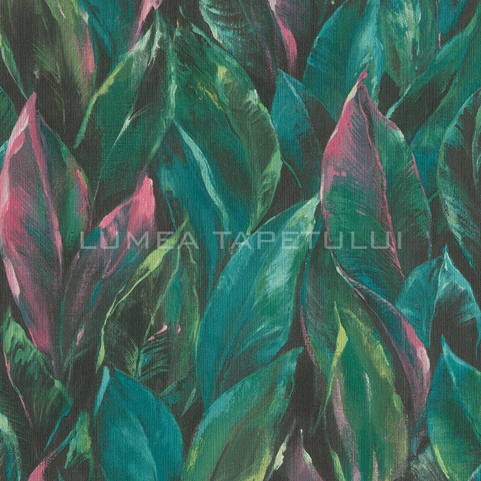 Tapet decorativ vinil super lavabil pe suport vlies ( se aplica adeziv doar pe perete ) lat de 53 cm si lung de 10 m. Model de tapet dormitor, model tapet model frunze Rasch 537352.