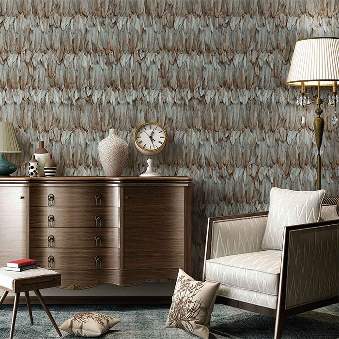 Tapet decorativ vinil super lavabil pe suport vlies ( se aplica adeziv doar pe perete ) lat de 1.06 m si lung de 15.6 m. Model de tapet living, model tapet exotic cu pene mari gri inchis si aurii. Acesta este un tapet modern , ce poate fi utilizat ca tapet dormitor , tapet living , tapet baie sau tapet pentru bucatarie .