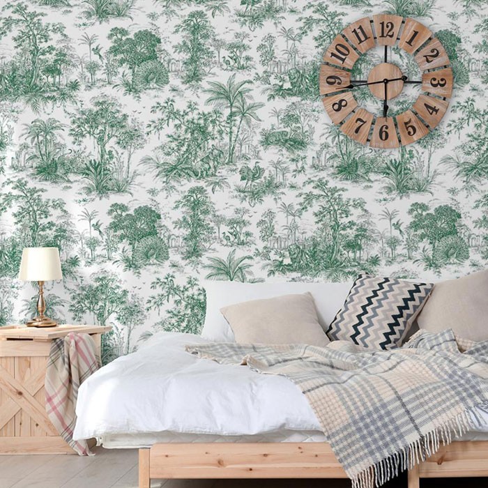 Tapet decorativ vinil super lavabil pe suport vlies ( se aplica adeziv doar pe perete ) lat de 1.06 m si lung de 15.6 m. Model de tapet living, model tapet exotic cu vegetatie si animale jungla verde pe fond alb. Acesta este un tapet modern , ce poate fi utilizat ca tapet dormitor , tapet living , tapet baie sau tapet pentru bucatarie .