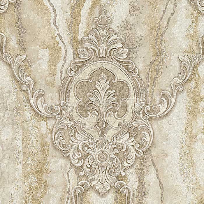 Tapet lux dormitor, living, hol Amuleto 83503, vinil super lavabil pe suport vlies ( se aplica adeziv doar pe perete ) lat de 106 cm si lung de 10.05 m. Model de tapet dormitor , model lux culoare crem – auriu.