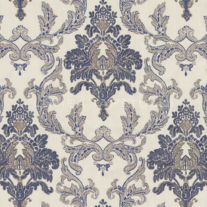 Tapet lux dormitor, living, hol Tesori d’Oriente 97232, vinil super lavabil pe suport vlies ( se aplica adeziv doar pe perete ) lat de 106 cm si lung de 10.05 m. Model de tapet dormitor , model lux culoare crem – albastru.