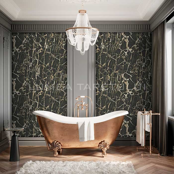 Tapet lux marmura dormitor, living, hol 84601 Carrara 3 , vinil super lavabil pe suport vlies ( se aplica adeziv doar pe perete ) lat de 106 cm si lung de 10.05 m. Model de tapet dormitor , model lux culoare negru – auriu.